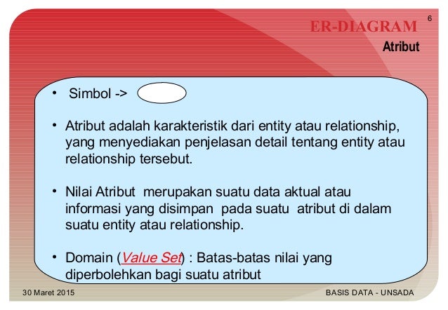Atau merupakan nama-nama property dari sebuah kelas yang menjelaskan batasan nilainya dari property yang. Nilai Atribut adalah Data actual atau informasi yang disimpan pada suatu atribut di dalam. Model Entity Relationship Adalah suatu penyajian data dengan menggunakan Entity dan Relationship.